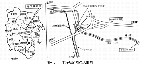 对于横滨市而言,为了求得防止和减轻今井川河流域的水淹受害。是在保土谷区猎场镇55号~权太坂2段的国道1号线下进行了修筑内径10.8m、长度2410m的地下调节池(贮存量为21.4万m3的内部水压隧道)的规则(图-1)。