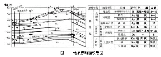地质构成在丘陵部分上方位置是埋土层、垆坶层、洪积粘性土、砂质土层,在此以下分布着是上总层群的固结粉砂层和砂质土层相互交替的地层。冲积低地部分(始发井附近)分布在丘陵部位上方,没有垆坶层,代之以分布着冲积粘性土、砂质土(图-3)。地下调节池(以下称为隧道)掘进在N值在50以上的上总层群的冲积粘性土层和固结了的洪积砂质土层相互交替层中。
