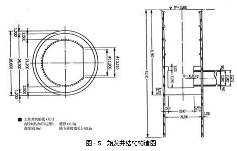 始发工作井在建成地下调节池(隧道)之后,是作为排水设施而加以利用。工作井井身是由地下连续墙和厚度为2.5m的内衬墙(预定上部为1.5m)组成(图-5)。