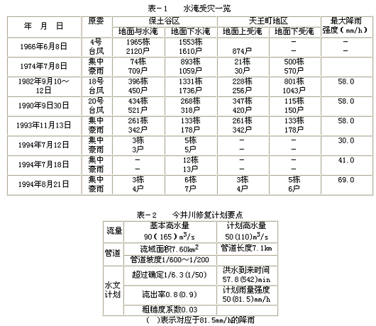 从1992年开始的建设省河道局的“市区河道内水对策特别紧急事业”的启动,今井川河亦作为这一类特定河道被采纳。在河道的整治同时,计划在地底下设置隧道式调节池,今井川河道修复计划的要点如表-2中所刊内容。
