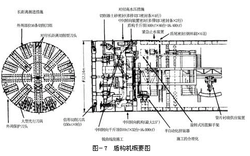 盾构机是外径φ12,140mm的泥水式盾构机,考虑到地质条件、长距离施工、高水压力、冻结部分掘削等条件,决定切削器刀头形状·配置等的规格。盾尾密封作为对付高水压力,是安装了刷子型4排和紧急止水装置。作为对付小半径曲线是作成2.5°中间转向结构构造(图-7)。