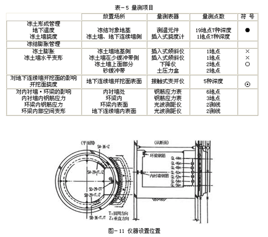 如在表-4中所刊示实施冻结准备、冻土造成、冻土维持和强制解冻。在此,所谓冻土造成,即为前面所述在开挖面处制造所需厚度的冻土墙。冻土维持是意味着维持所造成了的冻土墙安全性。为了管理这些事务,就兼用了有关冻土造成和冻结膨胀的量测工序。在冻结土堵的地基一侧开成冻土的同时期,作了化学注浆的施工。所实施的量测项目、量测仪器等在表-5中,而仪器布置的位置则在图-11中所表示。