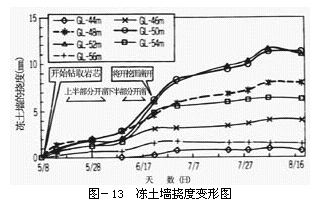 对于本工程,由于是大深度形的大的土、水压力,加上是大断面不利条件,在长时间内仅靠冻土墙承受,并且在维持冻土期间,作为抑制冻土的增加,还兼用了加热运转。为了确认作为受力墙的冻土墙的健全性,进行了量测冻土期间的冻土墙挠度。从图-13中得知,从开挖面清理开始起量测到冻土墙的挠度,开挖面外周钻取土样和从开挖面上半部分的地下连续墙撤除开始,第10~27天的工程,开挖下半部分清理(第33~46天)所致在中心部位发生了6mm的弹性变形。不过,在此之后的冻土墙的蠕动变形以缓慢方式,最大也只是在11mm,可以充分保障作为受力墙的健全性。