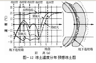 通过冻结运转使地基土和地下连续墙的温度降低的状况,在盾构机中间断面上的温度分布和冻土的水平分布(冻结第82天)表示出来(图-12)。