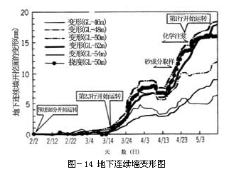 盾构机始发部位(开挖面上)的地下连续墙,在造成冻土完成之后是要撤除掉的,而通过冻土墙完成止水前,地下连续墙必须确保其起到受力墙和止水墙的作用健全性。冻土造成期间中在各深度上的地下连续墙的水平变形和所算出的盾构机中心部位的挠度时效变化如图-14中所示。由于冻土造成量的增加,由此地下连续墙的变形和挠度增加到接近管理值状况,进行砂缓冲沟的砂取样,将地下连续墙的挠度一下子回复到原状,抑制了挠度的增加。为完成冻土墙进行第一排冻结管的运转操作的结果,是使地下连续墙的挠度再次增加,于是就能维持通过冻土墙的止水完成前的地下连续墙的健全性。