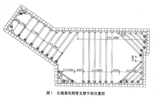 基坑采用人工挖孔桩+钢管内支撑作为综合支护体系。车站北基坑设置4层?600钢管横撑,用以维护基坑开挖围护结构的稳定。北基坑每层设钢管支撑27根,4层共108根。钢管支撑安设位置参见图1。