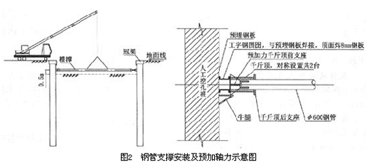 (3)钢管支撑:钢管支撑分节制作,每节标准长度为4.5 m,管节间采用法兰盘螺栓连接,钢管支撑的设计直径为600 mm,壁厚12 mm,吊装方式示于图2。钢管支撑端部(活动端)设预加轴力装置,其端部构造及顶加轴力方法见图2。