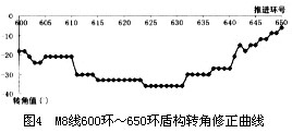 又如在推进402环~440环 (402环的转角为21′)时,盾构基本上处于④号灰色淤泥质粘土中,纠偏千斤顶处于纠偏状态,在推进至415环后,发现管片出现碎裂,于是改变盾构千斤顶编组,并采用左侧多出土的方式进行纠偏(即左侧螺旋机转速大于右侧),达到修正盾构转角的效果,见图3。