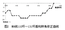 在实际施工中,应根据实际情况(结合土质等条件),单项或组合使用盾构转角的修正措施。如M8线110环~131环基本上处于④号灰色淤泥质粘土中,110环的转角为-12′(盾构向左转时角度定为负值),在推进过程中,纠偏千斤顶一直处于纠偏状态,同时千斤顶的编组由两边腰部千斤顶对称开启逐渐变为左下和右上千斤顶开启,盾构机推到131环时,其转角为0(见图2)。采用纠偏千斤顶以及千斤顶的编组取得减小盾构转角的效果。