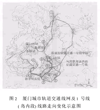 本文将结合厦门火车站至和平码头既有铁路线已经停用,以及福厦线引入厦门地区进岛铁路段复线后能力有较大富余的实际情况,针对厦门轨道交通1号线线路走向与既有铁路利用方案问题开展专题研究。11号线线路走向方案分析与调整建议2001年提出的厦门市轨道交通线网规划推荐方案[2],由5条轨道交通线路组成,线网规模为181km(见图2)。该推荐方案总体上符合城市布局形态,符合厦门市城市综合交通发展战略和对外联系通道的布局。该方案中的轨道交通1号线主要连接海沧、本岛、集美与同安区,起终点分别设于海沧和同安,规划线路总长度54.6km;在本岛采用厦禾路———嘉禾路———福厦路走向,较好地满足了厦禾路———嘉禾路等通道上的既有客流需求。但该方案存在以下几方面的不足之处:(1)如果上述方案的1号线(与既有铁路平行区段)采用地面线路型式,则其与原有铁路干线一起形成两条城市区域分割带,将使本岛东西向之间的联系状况进一步恶化。(2)如果上述方案的1号线(与既有铁路平行区段)采用高架线路型式,则一方面将使介于既有铁路与1号线之间的土地开发利用受到严重影响,同时还将严重破坏嘉禾路和厦禾路的景观,并造成道路周围的大量动迁。另一方面,根据国内有关城市的轨道交通建设经验,高架轨道交通建设项目每公里综合造价将高达3亿元人民币左右。如果采用地下线路型式,将使工程造价大大提高(每公里综合造价将高达5~7亿元人民币)。