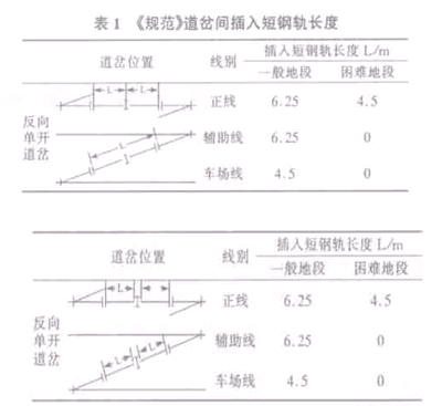 因此《规范》规定为不小于650mm显然是不够的,特别是双线隧道该问题将更加突出。建议《规范》6.3.1规定可改为“马蹄形隧道内混凝土整体道床应满足线路中心线两侧1200mm范围内不小于560mm”这对于单线和双线隧道均可适用。2.2轨下部位混凝土道床厚度 《规范》6.3.5中第3条:“轨下部位混凝土厚度,直线地段不宜小于130mm;曲线地段不宜小于110mm”。曲线地段标准比直线地段低不知有何根据。另外,该条文与《规范》6.3.1第1条:“轨道结构高度矩形隧道内混凝土整体道床为560mm”不相匹配。如按《规范》6.3.1第1条计算,直线地段最小厚度约为150~170mm之间,而6.3.5第3条却规定该数值不宜小于130mm。笔者认为6.3.5第3条规定如需列出,建议《规范》轨下部位混凝土厚度应分别按隧道内及高架桥上列出,同时应说明该厚度为轨枕下的尺寸,且曲线地段标准不应低于直线地段。2.3地面线碎石道床 《规范》表6.3.1第5条规定“地面线碎石道床为820~1000mm”,但是有些数值并不在上述范围。例如:60kg/m钢轨混凝土枕碎石道床,其岩石、渗水土路基道床厚为300mm,轨道结构高度为686mm。因此地面线碎石道床轨道结构高度应根据钢轨、轨枕类型、道床厚度、路拱高度等分别进行计算,不宜统一规定范围。2.4轨道结构高度的计算位置 由于隧道内混凝土整体道床地段的轨道曲线超高值采用外轨抬高超高值的一半、内轨降低超高值的一半的办法设置。因此在曲线时,轨道结构高度计算位置是以线路中心线为准,还是以曲线内轨中心线为准,《规范》中没有涉及。 笔者认为:矩形、马蹄型隧道混凝土整体道床轨道结构高度应以曲线内轨中心线为准,即曲线地段另加超高值一半设置。3轨枕铺设数量 《规范》表6.3.2中正线枕式整体道床轨枕铺设数量“直线及R>400m或坡度i<20‰”采用表中“1600~1680根(对)/km”。其中“或”应视为满足其中一个条件即可采用该档次标准。但实际上应是两个条件必须同时满足才能采用该档次标准。因此笔者建议应将“或”改为“和”。另外该表无试车线标准,建议将“正线”改为“正线和试车线”。4 减振轨道结构 地铁线路主要振动源是列车运行时轮轨相互撞击所产生的振动,经轨道结构传到隧道或高架结构,再传向大地,从而引发隧道或高架结构附近地面建筑物的振动。地铁振动对环境影响的主要因素是地质条件、车辆特性、轨道结构、隧道或高架结构等,另外还与线路中心至地面建筑等的距离、隧道埋深、地面建筑的类型及功能等有关。 《规范》6.5要求根据线路中心距离各类建筑物小于20m和穿轨地段,来确定采用何种减振轨道结构。在地铁工程减振轨道结构设计中,应根据地铁工程环境影响报告的要求,在满足GB10070 88《城市区域环境振动标准》规定的前提下,对超过国家标准的地段,确定其减振轨道结构型式及铺设范围。 笔者认为,在规范条文中规定“小于20m”,仅在无环保资料时供设计者参考。此部分内容可在条文说明中阐述。5尚需明确和补充的几个问题 以下几个问题尚需明确和补充,以便地铁工程设计时统一标准。 (1)《规范》5.2线路平面中表5.2.1的最小曲线半径及《规范》5.3线路纵断面中表5.3.8的竖曲线半径,只有正线、联络线、出入线的标准,无折返线、停车线等辅助线的标准。建议将“正线”一栏改为“正线、试车线”;“联络线、出入线”一栏改为“辅助线”。 《规范》5.3.1线路纵断面最大坡度只有正线、联络线、出入线的标准,无折返线、停车线等辅助线及试车线标准;《规范》5.3.2线路纵断面最小坡度只有正线的标准,无联络线、出入线、辅助线、试车线等的标准。建议补充。 (2)《规范》6.3扣件、轨枕及道床,中表6.3.8的碎石道床,厚度,无辅助线及试车线的标准。应将“正线”一栏改为“正线、辅助线、试车线”。 (3)《规范》6.3.7“地面的出入线、试车线和库外线宜采用混凝土枕碎石道床或木枕碎石道床”和6.3.14“正线、联络线、出入线和试车线的整体道床与碎石道床间应设轨道弹性过渡段”中,均缺少折返线、停车线等辅助线及车场库外回转线的内容。 (4)《规范》6.3.11的碎石道床,只列出正线、联络线、出入线、试车线及车场线的铺设标准,尚缺少辅助线的铺设标准。 (5)《规范》6.4道岔及其道床中表6.4.2的道岔间插入短钢轨长度,反向单开道岔相接时表中轨缝尺寸未表示(见表1)。如改为表2,笔者认为比较容易理解。单渡线时L小于表中数值,可采用胶接绝缘接头。