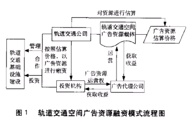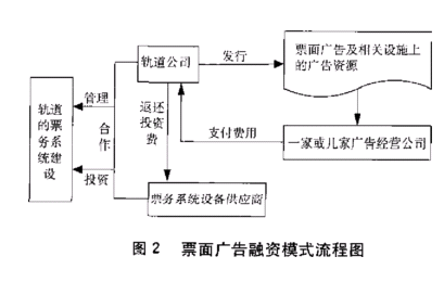 5 武汉市轨道交通空间广告资源经营建议 根据武汉市轨道交通网络规划,全市轨道交通由7条线路组成,全长220km。其中已开通运营的轨道交通1号线是1条在市区道路中敷设的高架轻轨交通。目前,武汉正通广告有限公司,获得该轻轨部分广告的独家代理权,该公司负责人称全部轻轨广告一年市场量将超过2000万元。随着武汉市轨道交通的逐步建设与完善,广告资源的价值将会成倍增长。如何有效地利用这部分价值,受到武汉市政府和轨道交通公司的高度重视。为此,这里提出一些广告资源经营建议。 (1)加强广告资源的监管力度,在最大化获取广告收益的同时,遵循广告资源经营原则,营造轨道交通美丽景观和良好的文化氛围,带动城市经济发展。 (2)在轨道交通规划与建设期间,把广告资源的设施规划考虑进去,采用有发展潜力的广告载体,保证可持续发展。 (3)对轨道交通空间载体进行较为全面的识别,正确估价,采用科学经营方法进行经营。 (4)充分发挥广告资源融资作用。如轨道交通票务系统融资,是一种较为特殊的融资模式(图2)。