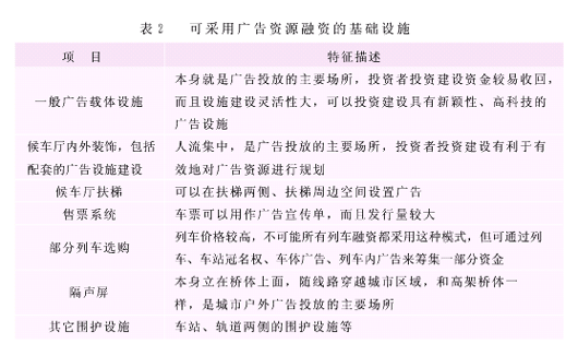 由于广告资源收益与轨道交通建设和运营总投资相比,所占比例很小,考虑到投资的风险和短期收益的收回,所投资的基础设施成本不应太高,应该与短期内投资机构能收回的收益相适应。因此,对于采用此种融资模式进行融资,可遵循以下原则。 (1)在约定经营期间内,所涉及广告资源的收益应与投资机构所投资基础设施成本相对应。这就要求对此期间广告资源作出准确的识别和科学的评估,同时也应考虑投资机构的收益和投资所面临的风险。 (2)所投资的基础设施能直接或间接地进行广告经营。投资机构进行投资主要是为了获取广告资源未来的经营权,并在建设期内对这部分广告资源合理规划,而且投资机构可知道所投入资金的用途,降低了投资风险。 (3)所考虑投资的基础设施建设运营成本不能太高。这主要受制于轨道交通广告资源的价值,如果建设成本过高,投资机构可能考虑到未来投资的收回期限太长、风险太大,而不进行投资,也就使得广告资源融资失去了吸引力。 根据上述原则,结合某些基础设施的特征,可识别出适合于此种融资模式的基础设施,表2列出了可以利用该模式的一些基础设施。 轨道交通公司在轨道交通建设的过程中,也可以采取BOT融资模式。对于轨道交通空间广告载体基础设施,如IDS媒体系统、乘客信息服务屏幕显示系统等,组成一个项目包,由其它机构投资并组织建设,当轨道交通通车运营后,由这个机构自营或代理经营这部分广告资源,经营期限满后把这部分广告资源的经营权移交给轨道交通公司。 此外,轨道交通公司还可成立专门的轨道交通广告资源机构,以广告资源未来的收益,向社会发行债券或者股票,来筹集资金。待轨道交通通车后,自营或者以代理运营广告载体的方式,来分配股息或偿还贷款。4.2轨道交通空间广告资源直接经营分析 (1)设置专门的广告资源经营机构。为使轨道交通广告资源真正发挥它的效益,轨道交通公司必须成立专门的机构,与专业的广告媒体公司合资或合作,利用他们先进的管理经验和经营策略,充分发挥现有广告资源的价值,以获取更高的收益。 (2)采用科学合理的经营策略。在遵循公开、公正的原则下,对现有广告资源采用效益最大化的经营原则进行经营管理,避免盲目。为此,应对可利用的资源,根据市场情况,进行正确的估价,在估价的基础上,可采用拍卖、招标的方式,引入有实力、专业能力强的大型广告经营公司对广告资源进行经营。 (3)预先考虑广告载体形式,采用有发展前景的广告载体。在轨道交通建设的过程中,应将广告资源纳入轨道交通规划与建设中去,引进具有发展潜力的广告载体IDS。IDS是一种新型的高科技媒体,它优于报纸、无线电,与当地电视台相当,每个站的每个显示系统都通过网络互联;相对电视台,IDS 系统有非常大的价格优势,同时该广告系统是非常接近消费群体的载体。它具有户外动态性、网络性、高经济价值性等特征。 (4)良好地规划利用广告资源,营造轨道交通空间文化。轨道交通改变着人们的生活方式,促进城市文明的发展和成型,影响城市价值形成和文明传承。更重要的是,轨道交通作为一种手段、一种生活方式、一种思维模式,日益深刻影响城市文明的生成和人格塑造,轨道交通空间文化已成为城市文明重要的特征。 轨道交通广告,不仅是反映城市经济繁荣程度的标志,而且能营造轨道交通空间文化。对广告资源进行良好地规划和对广告形式、内容进行合理地监管,使之与周边环境能形成和谐的统一整体,从而反映城市经济的特征,营造出有特色的轨道交通空间文化。