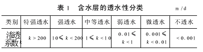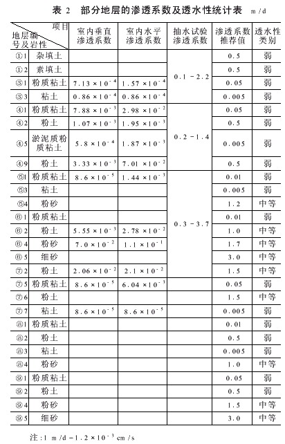 3.3 地层透水性特征(1) 渗透系数和透水性关系 潜水、微承压水含水层含水介质颗粒较细,水力坡度小,地下水径流十分缓慢。部分地层的渗透系数及透水性统计如表2所示。(2) 地层透水性分析 勘察范围内的地层由粘性土、粉土和粉细砂等组成,其中第Ⅰ陆相层(Q43al)、第Ⅰ海相层(Q42m)和第Ⅱ陆相层(Q41al)主要由粘性土和粉土组成,局部夹淤泥质土,渗透系数均小于1m/d,一般为弱透水层。第Ⅱ陆相层(Q41al)中的粉质粘土和粘土的渗透系数约0 01m/d,为弱—微透水层,可划分为相对隔水层。第Ⅲ陆相层(Q3eal)主要由粘性土、粉土和粉细砂组成,粘性土、粉土的渗透系数均小于1m/d,为弱透水层,粉细砂的渗透系数大于1m/d,为中等透水层。(3)浅层地下水的水文地质特征潜水:人工填土层为①1杂填土、①2素填土,土体结构松散,含水量丰富,土层渗透系数大。第Ⅰ陆相层以③1粉质粘土为主,土体渗透性能差,土层渗透系数小。第Ⅰ海相层主要含水层为④2、④9粉土。④1及④8粉质粘土中夹有大量粉土透镜体,储水量较大,但出水量较小,垂直、水平方向渗透系数差异较大。微承压水:在天然状态下,赋存于第Ⅱ陆相层(Q41、Q41al)、第Ⅲ陆相层(Q3eal)和第Ⅳ陆相层(Q3cal)粉土、粉细砂中的地下水具微承压性质,但不宜被称为典型的承压水。因为典型的承压水应该有稳定的水源补给,并应有稳定的不透水顶底板,而作为相对隔水层的第Ⅱ陆相层(Q41al)粉质粘土和粘土中有夹层,个别地方还有“天窗”。特别是第Ⅲ陆相层(Q3eal)中的粉细砂并非稳定分布,规模小,呈透镜体状,故自身无稳定的补给来源,而是由上下渗透性小的粉质粘土、粉土渗透补给。 赋存于第Ⅱ陆相层和第Ⅲ陆相层粉土、粉细砂中的微承压水属于第1层微承压水,分布在地表以下16~28m,接受上部潜水补给的同时又排泄给下部第2层微承压水。该层水对地铁工程影响最大。 赋存于第Ⅳ陆相层及以下的粉土、粉细砂中的微承压水属于第2层微承压水,分布在地表30m以下,接受上部第1层承压水补给的同时又排泄给下部的深层承压水。由于埋深较大,该层水对地铁工程影响相对较小。(4) 潜水和微承压水的关系 由于上部潜水补给下部微承压水,承压水层之间又相互补给,所以浅层承压水各含水层存在明显的水力联系,又具有明显的垂向不均匀性。浅层地下水是统一含水体,只是由于局部地段地层透水性分布的差异性,对地铁结构物的施工影响程度也不同。(5) 粉质粘土和粉土透水性的分析 粉质粘土的塑性指数(Ip)一般为12~14,砂性较大,不是绝对的隔水层,具备一定的透水性,所以各含水层上下之间存在地下水补给关系。粉土的塑性指数(Ip)一般为8~10,粘粒含量一般为9%~15%,砂性较大、粘粒含量亦较大,其透水性也是相对的。