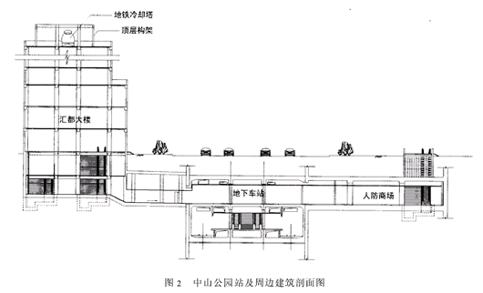 中山公园站位于长宁区的主干道长宁路下面,西邻凯旋路,这里是长宁区最繁华的地段之一,也是长宁区政治、商业和文化的中心。根据地区规划,车站的北侧有规模宏大的长宁商城,另外还有兆丰嘉园住宅区,玫瑰坊商场,人防商场,地下大车库及中山公园;车站的南侧有汇都大楼,新时空广场,长宁贵都公寓和华美达商城;车站的西端则紧邻轨道交通3号线中山公园站。根据长宁区规划部门的意图,拟依托地铁车站为主体连通周边地下空间,而在地面则用空中走廊连通周边建筑群,使这一地区形成长900m,宽400m规模四通八达的地上地下商业街。面对宏伟的规划蓝图,我们在轨道交通设计中充分配合区政府的开发意图,把地区规划与车站总体设计统筹考虑。总的指导思想是充分利用本站为前折返终点站的特点———车站长度长(全长419m),除了站台层有折返线外,在站厅层沿东西向留出一条狭长空间作为把周边地下空间连系起来的纽带。具体的做法是:车站的西北面是在建的长宁商城及公交集散点,超大型的商场和办公楼将成为这一地区的亮点。当时正值东南亚经济风暴,曾一度暂停设计,但我们考虑今后在不开挖道路的情况能使商城地下层与车站站厅层相连通,为此把车站和商城之间的连接段同步实施,并专门设了①号、②号和②号甲三个出入口出地面,为长宁商城后来的实施、连通创造了良好的条件(目前已在实施)。同样,在车站的中部和东北面是地下人防商场、玫瑰坊商场及大型地下车库与地铁紧邻,我们根据人防工程平战结合的要求,同时考虑到商场、车库与地铁运营时间的不一致及消防疏散等要求,将③号及④号出入口通道穿越人防商场,并采用防火卷帘门作分割处理。这样人防商场及地下车库的人员都能方便的进入地铁站厅,同时也方便了兆丰嘉园住宅区的居民及中山公园站游客进入车站。在车站的南侧,我们同样把汇都大楼、新时空广场、长宁贵都公寓及华美达商城等大型建筑的地下室与车站站厅层相连通,并设了⑤、⑥、⑦、⑧四个出入口出地面,极大地方便了办公、购物及公寓等人员的出入。在车站的西端,我们也在凯旋路下专门设了二条地下通道与轨道交通3号线的中山公园站连通换乘。这样,我们利用车站站厅层的长通道作为纽带,把周边地区的重要建筑都连通了,成了名副其实的地下商业街,这不仅促进了地区商业的发展,同时也通过这条地下街汇集或疏散地铁客流,大大减少了地面交通的压力,方便了老百姓。3轨道交通车站出入口、风亭等设施与地面建筑的结合 轨道交通车站出地面的建筑主要是出入口、风亭和冷却塔。它是车站设计中比较难处理的部分。国外有的城市(如韩国汉城)轨道交通出风口直接放在人行道上,不仅发出噪声,而且还有热风吹出,使行人受到影响,甚至有不安全感。我们在设计出入口和风亭时主要从“隐”字着手,即能与街面建筑结合的尽量结合进,实在无法结合的,则借助绿化隐蔽。如车站西南面有一个出入口(即⑧号口)、两个活塞风井和进、排风亭一个,还有二个体量较大的冷却塔和一个残疾人电梯。所有这些我们都巧妙地把它与汇都大楼结合在一起,并在建筑立面上作适当处理,特别是二个大型冷却塔,专门在大楼屋顶做了个假层(构架),将它遮挡隐蔽(见图2,3)。③号出入口及中间的进、排风亭则与玫瑰坊地面建筑相结合,使环境得以妥善处理。④号出入口周围没有街面建筑可结合,四周全是绿化,如采用敞开出入口可能不易让乘客找到,因此我们做了金字塔形的玻璃棚建筑,既通透,又给人以艺术小品的感觉。又如车站东北面的活塞风亭及人防商场的进、排风亭均在绿化广场内,我们采用朝天低风井(露出地面部分喷绿色涂料),并在周围植树隐蔽,使风亭隐在绿化中(见图4)。总之,虽然本站有九个出入口和近十个风亭,但由于大部分与街面建筑相结合设置,并采取了一些“隐”的措施,因此没有给这一地区的景观添乱,这也是设计者感到欣慰的地方。