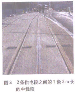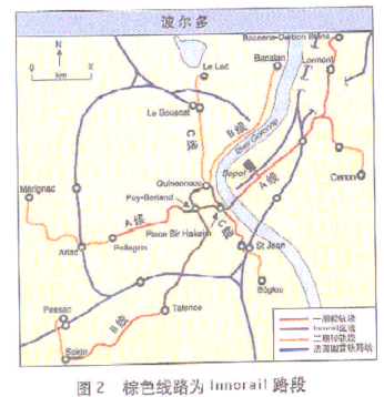 电力轨的材料为玻璃纤维,成“工”形。与电缆连接的2根金属板条安装在“工”形轨的表面。“工”形轨的中心是4条狭槽,用于铺设DC750V的铜线、绝缘节回线、通信和辅助设备。“工”形轨的高度为17cm,导电段长8m,被3m长的绝缘节所分隔。绝缘节安装有平行塑料接触板条,向集电靴提供连续的行走表面。电力控制装置之间的间隔为22m,当轻轨车辆驶过时,电力控制装置便激活带电段。在车站停留时,由司机在Innorail和高架供电系统之间进行转换。决定采用停车时进行转换的模式是为了简单易行。当然,Innorail也可以采用车辆行走时进行转换的模式。Innorail设计速度70km/h。 集电靴采用石墨制成。设计这种集电靴的目的是在接触板条上施加10kg的作用力。当受电弓工作时,集电靴被抬起。每一辆轻轨车辆的顶部配备一个11节蓄电池组块,如果Innorail系统发生故障,这些蓄电池可提供电源,使车辆能在低速条件下运行1 km。该电气化路网的高架供电系统和地面供电系统均使用DC750V电源。 波尔多市原计划建设自动化VAL轻轨地铁,后由于轻轨路网的覆盖范围更为广泛,最终采取了轻轨路网方案。2000年6月,项目一期工程的合同授予了以ALSTOM公司为首的联合体。项目的工程设计委托给GET联合体。Innorail将由ALSTOM维护10年,Connex公司将负责运营和维护轻轨路网其余路段。按2001年1月的价格水平计算,项目一期工程的成本估计为6.3亿欧元,其中包括机车车辆。项目二期工程的成本预计为5.6亿欧元。波尔多市社区自己出资总费用的60%左右,其中主要来源是为VAL项目预先提留的资金。其余将来源于补贴和贷款。 ALSTOM公司将提供70辆低地板Citadis轻轨车辆,其中5辆用于一期工程。 A线和B线将各运营56列车,每列长44 m,其运能均高于C线。这些车辆有90个座位,按4人/m2计算,总载客量为300人。C线将配备14列轻轨车。每列33m长,48个座位,按4人/m2计算,总载客量为218人。 波尔多市的轻轨车辆将首次装有车顶罩,该设计是出于美观考虑,但同时也是为了确保安装在车顶的电气设备有充分的通风,尤其在气温较高的夏季。 如果在市中心轨道与建筑物的距离不到12m,则铺设浮置板式轨道。市中心轨道的曲线半径为18m。在接近曲线处,轮缘涂油器工作,以将噪声降到最低程度。波尔多市社区就此项目的噪声和振动问题,制定了严格的限制标准。法国的标准是78dB,而此项目规定的噪声标准是74dB。轻轨车辆的转向架设有裙边,以减少噪声的扩散。在车轮上安装有隔声减振环,将噪声和振动降低到最低。 3条轻轨线路将在市中心平面交叉通过。与法国国营铁路(SNCF)有5处换乘点,与公共汽车有3处。将开设14个车站停车场,为鼓励驾车出行的人们换乘轻轨车辆,轻轨车辆的乘客将免费停车。期望以此吸引25%的轿车使用者。 在运输高峰期,轻轨车辆的行车间隔为4min,非高峰期8min。A线和B线的运能为单方向4500人/h,C线3500人/h。运营时间从早晨5点至次日凌晨1点,仅留出4h进行日常维护保养。 波尔多市社区原期望在2003年12月开始A线一期工程的运营,B线和C线的一期工程2004年2月投入运营。但由于承包市中心土木工程的一家公司的破产,而不得不另请一家公司。施工虽然恢复,不过工期已经延误。 二期工程计划2005年开工,2007年初竣工。届时,约85%的路网将拥有专用通行权。二期工程包括一座桥梁,该桥梁将配备一特殊的悬链系统,有一点像列车上的塞拉门,从而桥梁能被打开而使轮船通过。此段线路与一条货运线也有一个平面交叉。 参考文献1David Briginshaw. WirelessLight Rail Comes to Bordeaux.International Railway Journal,2003(7)