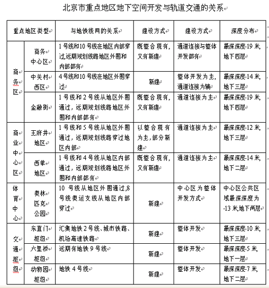 根据最新一轮的北京城市轨道交通建设规划,2004~2015年修建线路总长367.1km,加上目前的运营线路114.1km,至2015年之前将形成481.2km运营网络,城市轨道交通将成为公共交通的骨干。下表是地下空间开发与城市轨道交通的关系: