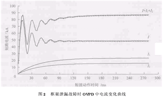 列车的正常起动及运行时,钢轨-地电位升高。当OVPD测出钢轨-地电位超过整定值时,OVPD动作,将钢轨与地短接。由图1可知,OVPD与框架保护的电压元件测量基本上是同一个电压值。此时框架保护不应动作。目前采取的配合方式是框架保护电压元件动作时间整定值比OVPD动作时间整定值长(相同的测量电压条件下),或电压整定值比OVPD要高。 当直流设备的正极对设备外壳发生短路故障时,OVPD和框架保护的电压元件均检测到一个瞬时的高电压。此时要求框架保护应先于OVPD动作。3.2框架保护存在问题分析 (1)轨道交通投入运行初期,钢轨对地绝缘性能较好,当牵引所直流设备发生框架泄漏故障时,流过电流元件中的电流很小,框架保护电流元件不动作。当电压元件检测到钢轨和地之间的电压大于整定值时,框架保护在整定的时间内动作,整流机组交、直流侧断路器跳闸。当某一个牵引变电所发生框架泄漏故障时,整条线路的钢轨对地电位都会升高。即各个牵引变电所框架保护电压元件会检测到负极与地之间较高的电压值,并同时起动框架保护。如此,其它未发生框架泄漏故障的牵引变电所框架保护产生误动作,扩大了事故停电范围。当接触网对架空地线发生短路时,其动作情况与其相同。 (2)经过一段时间运行之后,钢轨对地绝缘性能下降,过渡电阻减小,发生框架故障时框架保护电流元件能够可靠动作,并作用于相应的断路器跳闸。但此时钢轨与地之间的电位差值减小,当整定值过高时,框架保护的电压元件不动作。 (3)直流设备发生框架泄漏故障时,本所的直流断路中没有电流或很小的电流流过(邻所贡献,如图1中I1/2、I2/2),直流快速开关不能在短时间内切除故障,即使直流断路器能快速跳闸,框架泄漏故障也未切除。只有当整流机组交流侧断路器跳闸后,才能切除框架泄漏故障。在故障切除之前,OVPD两端的电压与框架保护电压元件测量的电压相同,若OVPD不能在要求的时间内闭合,则可能导致电击伤人事件的发生。当OVPD动作后,形成了一个金属性的近端通路,通过OVPD的短接作用使框架保护电流元件中流过较大的短路电流,框架保护装置能够可靠动作,迅速切除故障。 当接触网对架空地线发生短路时,OVPD的快速动作使架空地线与负极间形成了一个金属性的通路,馈线断路器及架空地线中流过较大的短路电流,可使本所馈线断路器中的大电流脱扣,保护/定时限过电流保护动作快速跳闸,切除故障。 从以上分析可知,框架保护电压元件在实际使用过程中存在误动和拒动的可能性,有时不但起不到保护设备的作用,反而会造成事故障范围的扩大。因此建议框架保护中取消电压元件。4OVPD电气参数分析4.1OVPD的类型 OVPD主要有两种类型:接触器型和晶闸管接触器组合型。 接触器型OVPD,是在检测到轨地电位值高于整定值时,接触器动作,将钢轨与地短接,其动作时间约为150~200ms。 晶闸管接触器组合型OVPD,由晶闸管回路及接触器回路两个主回路构成。当检测到轨地电位值高于整定值时,晶闸管快速导通,同时起动接触器动作,将钢轨与接地极短接,因此其动作时间非常短(约为3ms)。4.2 晶闸管接触器型OVPD主要参数的选取(1)OVPD承受的最大短路电流 直流牵引供电系统中,OVPD承受短路电流最严重的情况是发生框架泄漏故障或接触网与架空地线短路时。当OVPD动作后,晶闸管主回路中通过的短路电流为本所整流机组提供的短路电流I及相邻牵引所提供的短路电流I1、I2之和(如图1所示)。根据计算结果可知(对于不同容量的整流机组、牵引变电所间距,其电流值将有所变化),晶闸管主回路中电流的变化如图2所示。因此在选取OVPD时,OVPD承受短路电流的能力应能满足最严重故障时的短路电流而不致损坏。