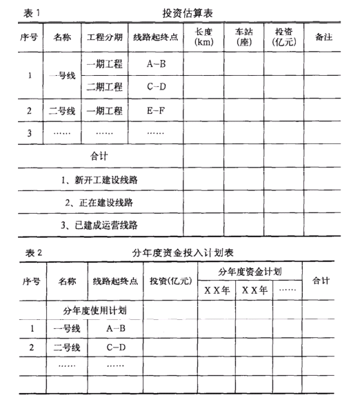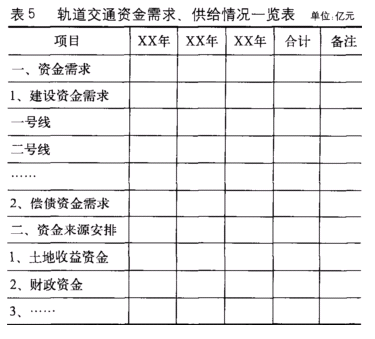 2、 所需资金的安排①分年资金投入计划 首先作好项目工期安排计划,然后根据项目实施计划及资金需求,编制分年资金投入计划表。其一般格式如表2所示。②投资强度分析 主要分析分年投资占城市国内生产总值的比例,以分年度投资计划GDP关系一览表的形式表达出来。分年度投资计划GDP关系一览表一般格式如表3所示。 从表中可以分析出年投资占国内生产总值的平均比例、最高年份比例,用以分析投资强度。一般来说,年投资占国内生产总值的比例平均不要超过1.50%,否则会超出城市的经济承受能力,给城市经济造成较大的压力。二、建设资金的筹集渠道和方式 城市轨道交通建设项目的建设资金一般来源于资本金、债务资金和其他资金。1、资本金 资本金一般来源于当地政府安排的财政性资金。根据有关规定资本金不得低于建设资金的35%,并尽量提高这一比例,以提高城市轨道交通建设项目的建设资金来源的可靠性。 从目前的一般情况来看,当地政府安排的财政性资金包括土地收益资金、财政预算内资金以及少量的其它资金。具体的资金应由当地政府明确提出并以文件或其它方式承诺。2、债务资金 除资本金以外的所需其余建设资金,一般通过银行贷款、发行地铁建设债券等方式筹集,绝大多数城市通过银行贷款筹集。具体的资金应由贷款银行提供贷款意向书方式承诺。3、 其他资金 一般包括折旧资金、地铁。建设规划一般考虑5~10年,在此建设期间部分线路已开通,提取了部分折旧及有了经营利润,这部分资金也可用于建设资金。三、项目资本金的筹集与安排前面已对项目资本金的来源作了安排,本部分着重对资本金的筹措能力进行分析。1、土地收益分析 作为城市轨道交通建设资金的主要来源,主要从所在城市土地收益资金近年来逐年收入情况和储备用地量及建设用地供应总量情况两方面分析,以判断土地收益投入的可靠性。2、财政预算内资金分析 主要分析各年政府财政资金投入占财政收入的比例,以分年度财政资金投入与财政收入关系一览表的形式表达出来。一般格式如表4所示。 从表中可以分析出财政资金投入占的平均比例、最高年份比例,用以分析政府财力的承担能力。以判断财政资金投入的可靠性。四、债务的估计及运营盈亏的估计1、债务的估计及筹措 根据建设资金的需求和资本金的安排估算债务资金的需求。对债务资金筹措作出安排并对债务资金筹措能力进行分析,以判断债务资金投入的可靠性。2、运营盈亏的估计 根据客流预测及运营收入、运营成本、折旧等的估算,对运营盈亏作出预测。五、资金平衡的方案和设想1、资金平衡方案 根据前面建设资金的估算及筹措、债务的估计及筹措、运营盈亏的估计,做出资金平衡方案,以轨道交通资金需求、供给情况一览表的形式表达出来。一般格式如表5所示。