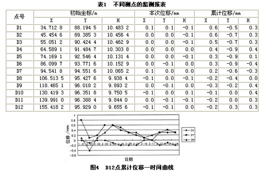 表1为不同测点的监测报表,图4是D12点的累计位移—时间的曲线图。