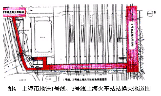 类似的情况也发生在1号线上海火车站站的规划建设中,地铁上海火车站站垂直于铁路上海站,地铁车站折返线上部的站厅层位于铁路上海站的站台下,由于路网规划以及其它种种原因,地铁车站站厅层的其中一段被铁路车站行包地道所阻断所阻断而无法贯通南北,以致地铁1号线上海火车站站与明珠线上海火车站站不能直接沟通,未能形成较便捷的换乘条件,同时上海火车站北广场的地铁乘客也不能直接进入地铁上海火车站站乘车,广大乘客颇感不便。(见图4)