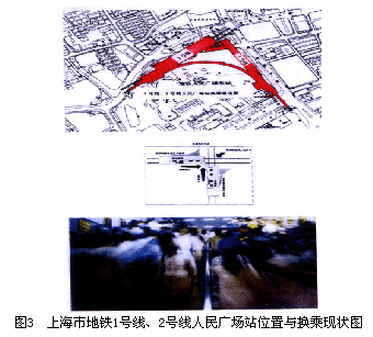 地铁1号线是一条南北向直径线,在人民广场的东侧,平行于西藏中路建人民广场站。地铁2号线是一条东西向直径线,在人民广场北侧,平行于南京西路建人民公园站。两线在南京西路、西藏中路地下交叉。地铁1号线隧道位于地下二层,地铁2号线隧道位于地下三层,两线车站呈L形布局,车站的端部与中部建有联络通道。目前,1号线与2号线间换乘客流量已达10万人次/天,预测客流换乘将达13万人次/天。由于地铁1号线、2号线均为岛式站台,无法在站台层内将不同换乘目的、不同换乘方向的客流分开,每一个换乘通道内的换乘人流兼容双向的换乘目的、换乘方向。当换乘人流很大时,就会出现换乘通道、楼梯等处的人流混乱和拥挤。 其次,地铁1号线、2号线站位呈L形布局,绝大多数换乘人流通过L形直角拐点的通道换乘。而L形拐点正面对人流量最大的南京路步行街,使换乘通道接受巨大压力。为了缓解来自南京路步行街的大量压力客流,1号线南京路出入口限制为出站人流,进站人流改从2号线出入口进站,大大增加乘客的走行距离,极不合理。这是由于线网规划的滞后,未能在建设1号线人民广场站的同时规划1、2号线的换乘,并且在1号线车站设计中亦未预留原4号线(现M8线)同站台换乘的条件。(见图3)