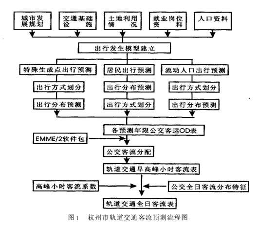 杭州市轨道交通客流预测中的一些问题及对策摘 要 从客流预测前期工作、客流预测方法这两个方面介绍了在杭州市轨道交通客流预测过程中对于一些问题的解决方法。关键词 杭州,客流预测,轨道交通,问题,研究对策 客流预测是轨道交通网络规划的一个重要组成部分,可为网络规划提供客流数据分析资料,从而为轨道交通网络规模的论证及线网规划方案的比选提供直接依据。客流预测的可靠性直接影响到轨道交通网络规划的科学性。然而,由于轨道交通客流预测涉及因素众多(如人口、土地利用、就业岗位),预测过程又较为复杂,规划工作者难免会遇到各种技术问题。现以杭州市轨道交通客流预测为例,谈谈轨道交通客流预测中的一些问题以及研究对策。1杭州市轨道交通客流预测方法简介 杭州市轨道交通客流预测系以1997年及2000年的土地利用调查、就业岗位调查、居民出行调查以及1985年的流动人口、特殊生成点(机场、火车站、客运码头等客运出入口)调查为基础,以城市总体规划、分区规划、已批复控规为依据,以EMME/2交通规划软件为操作工具进行的。根据客流预测的需要,该轨道交通客流预测建立了三种与客运交通相关的模型,分别为:居民出行模型、流动人口出行模型、特殊生成点模型。客流预测模型采用传统的四阶段模型方式,由出行生成模型、出行分布模型、出行方式划分模型及客流分配模型等四部分组成。预测流程见图1。