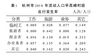 2轨道交通客流预测的问题及研究对策 在客流预测的实际操作中,往往会遇到各种问题,如何将这些问题解决好直接关系到客流预测的可靠性。2.1 前期工作方面 轨道交通客流预测的前期准备工作与常规交通规划的前期准备工作相同,包括基础资料搜集、交通小区划分、各类交通调查、在EMME/2数据库建立基础路网等。前期工作考虑的周密细致与否,与客流预测往返工作量的大小直接相关。下面讲述前期工作中的两个重要问题。2.1.1 交通小区与轨道交通站点的关系 对于一般的交通规划模型来说,交通小区设置数量和交通小区划分取决于规划区面积、模型要求精度,以及地形、地貌、用地性质等因素。杭州市轨道交通客流预测初始也是根据这种常规方法来划分交通小区的。然而在以后的客流分配中发现,如果有两个轨道交通站点同属于一个交通小区,由于最短路径(最便利路径)的关系,不论怎样调整常规公交线网的布置,客流分配下来后常常会发生上客流量偏向其中一个站点,下客流量偏向另一个站点的现象。而由于生活在市郊的客流出行主流向比较单一(向市区),这种现象尤为突出。由此考虑到,为了保证沿线客流量及各个站点上下客流量预测的准确性,在交通小区划分中,应将不同的轨道交通站点划分到不同的交通小区中去,因此交通小区的划分要较常规的交通规划项目划分得更细。同时,这样的划分也满足不同轨道交通站点服务于不同区域的功能要求。 在前期工作中根据轨道交通站点的位置划分好交通小区非常重要。在杭州市轨道交通客流预测中,因为事先没有重视这一点而导致了大量的往返重复工作。2.1.2合理布置常规公交 进行轨道交通客流预测需在EMME/2数据库建立客流预测基础网络。杭州市客流预测基础网络包括基础路网和规划公交线路网两部分。基础路网:杭州市轨道交通客流预测基础路网采用《杭州市城市总体规划》及杭州市各分区规划所确定的2010年路网。 规划公交线路网:根据《杭州市公共交通规划》中所确定的公交规划目标,轨道交通客流预测所采用的公交线网应是一个以轨道交通为骨干,以良好的常规公交网络为辅助,以轨道交通与公交换乘为主要节点的城市公交网络。因此,EMME/2数据库中公交网络的建设分为以下三个层次: 第一层次,轨道交通线路,运营速度35km/h; 第二层次,地面公交走廊,主要承担中远距离的客运,以弥补轨道交通布局上的不足; 第三层次,地面常规公交线网。 其中,第二层次与第三层次是常规公交的布置,与客流预测结果的关系很大。常规公交线路布置的疏、密程度对轨道交通客流量的大小会产生显著影响。 在杭州市轨道客流预测中,常规公交的布置原则如下:城市中心区内,主、次、支路上布置棋盘状的支线连接商业中心、居住区、换乘枢纽等,为主干线集疏客流;城市外围区域之间,布置公交线路沟通相互间联系,在城市副中心或区级中心之间形成一环形的公交通道;郊区线路在城市外围区域的公交换乘枢纽与公交主干线或轨道交通连接,换乘进入市中心区。风景区旅游公交线,建立起相对独立的、沟通各景点联系并与城市公共交通形成衔接良好的旅游公交线网。副城逐步建立起相对独立的服务于各自区域的公交线网。 在具体布线时,特别要注重常规公交站点与轨道交通站点间的换乘。因为换乘的方便与否与公交出行时间、客流量大小关系密切。从公交线网布局的合理性来说,除了规划确定的换乘枢纽外,每个轨道交通站点至少应与1~2条公交线路有方便的联系。因此,在进行前期常规公交布线时,应重视轨道交通与地面交通的衔接。 实际操作中,常规公交路网的布置是在客流预测结果上不断完善的,其布置的合理程度(密度、走向、停靠站等)最终可从公交出行方式比例、轨道交通占公交方式比例、平均公交方式出行时间、轨道交通平均运距等参数的预测值与分配值是否吻合中来得到验证。在杭州市轨道交通预测中,由于前期常规公交布线考虑的较为周全,因此这方面的往返工作量相对较少。2.2客流预测方法 按客流预测模型的操作顺序以及操作手段,从以下两个阶段来介绍杭州市轨道交通客流预测中关于一些问题的解决方法。2.2.1出行产生 出行产生普遍采用发生率模型来进行预测,但是不同类型、不同出行目的的出行者高峰时段的出行产生率差别很大。尤其是流动人口和特殊生成点,不能用单一的发生率数值来反映其群体出行行为。(1)流动人口在杭州市轨道交通客流预测中,将流动人口分成五种类型,分别为:临时工、旅游者、探亲者、办业务者、其它。将其出行目的也分为五种,分别为:工作、旅游、业务、其它。根据基础年调查所得的各类流动人口各出行目的发生率以及规划年的预测流动人口发生率,得出规划年的各项流动人口高峰小时出行发生率。表1为杭州市2010年流动人口高峰小时出行发生率。