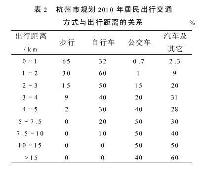 (2) 特殊生成点 特殊生成点即机场、火车站、客运码头等客运出入口。特殊生成点的高峰小时出行产生量关系到高峰小时到发客流量。由于特殊点的交通产生量较难用出行发生率来表示,杭州市特殊生成点的交通产生量是以各特殊点交通产生量的基年数据(调查所得)为基础,根据流动人口及城市居民的增长情况确定的。由此得出,2010年早高峰2.5h内,乘飞机、火车、长途汽车、轮船到达杭州的人数为21192人次,其中流动人口为14834人次;离杭的人数为47870人次,其中流动人口为33509人次。然后再以各个特殊点的规划建设规模(日客流量)来将这些总出行量分布到各个特殊点去。2.2.2出行分布、交通方式划分和交通分配 出行分布是将各交通小区的生成(吸引)量分解成各交通小区间的出行交换量。交通方式划分即将全方式的出行分布矩阵换算成各个交通方式的出行分布矩阵。交通分配即将各个交通方式的出行分布矩阵分配到路网上去。杭州市轨道交通客流预测中最重要的一部分———居民出行模型系采用后方式划分的方法进行。从常规的交通规划模型流程来说,出行分布、交通方式划分和交通分配是相互独立的三个阶段,一般是在一个阶段完成后再进行下一阶段的工作。但是这样往往造成分配出来交通流量及各交通运行参数与实际情况有较大的出入,欲修正时却又千头万绪,无从着手。为了避免这种情况的发生,在杭州市轨道客流预测居民出行模型中,将这三个阶段通过迭代的方法统一操作进行。杭州市轨道客流预测采用重力模型作为分布模型,公式如下:Pij=Ki×Kj×Pi×Aj/F(tij)式中:Pij———交通小区i和j之间的出行量;Pi———交通小区i的发生量;Aj———交通小区j的吸引量;F(tij)———交通小区i和j之间的交通阻抗:F(tij)=exp(β×Tij),其中Tij为交通小区i和j之间的出行时间,来自于EMME/2程序,β为标定系数;Ki、Kj———调整系数。 由于采用后方式划分,在这里β的标定十分重要,直接关系到交通方式划分比例以及轨道交通的平均运距。表2为杭州市圭划2010年居民出行交通方式与出行距离的关系。