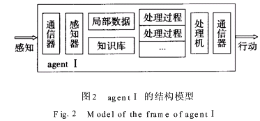 该系统由system-agent存储各个agent的状态(未触发或已触发)和系统时钟.系统启动时,首先由SCC-agent读取数据库,初始化VME-agent、MMI-agent、系统时钟比例和初始时间等.在系统按照系统时钟扫描的一个周期内,系统事件按照时刻表被触发,VME-agent中存储的设备环境状态发生变化.该变化被相应的entity-agent感知,entity-agent将感知的结果反映给SCC-agent,经SCC-agent整合与处理,制定出监控策略,下放到VME-agent.改变相应设备状态,VME-agent再将这些变化与MMI-agent进行通信,MMI-agent将改变了的设备重新显示.TD-agent通过VME-agent获取时刻表信息,并将调整的列车计划通过VME-agent传送至SCC-agent.SCC-agent是一个智能的知识系统,其内部的entity-agent的各个设备间可实时进行数据通讯,SCC-agent主要负责区段运行监控任务,实时进行监控策略的调整.各层agent的具体功能如下: 1仿真控制中心agent.SCC-agent的职责是负责将列车运行计划(列车运行图信息)以及突发情况下的列车运行变更计划实时下达到仿真环境agent,并对反馈的信息作出处理,即列车运行控制. 2仿真环境agent.VME-agent通过在输入、输出通信器总线上侦听,可以获取模拟盘上设备的状态(道岔的定、反位等),把这些区段占用、空闲状态,线路、车站的构成,列车群的运行等信息发送到环境模型中,控制列车的运行方向.向SCC-agent提供轨道电路占用情况,列车计划的调整信息,并将处理SCC-agent的列控编码输出写入仿真环境中. 3底层控制agent.底层控制agent包括线路agent、列车agent、信号机agent、车站agent.分别接收来自VME-agent的轨道电路控制信息、列车信息、信号机信息和车站信息,它们并不直接对这些状态信息作出处理,而是将其实时通知给SCC-agent, 由其作出决策. 4人机界面agent.通过MMI-agent的控制界面,设置设备运行环境模型中的线路设备状态,实现特定环境的仿真.通过MMI-agent提供的监视控制界面,可以观察列车在线路上运行的完整仿真过程.实现系统控制功能,包括初始化条件的选择、模型的选择、系统启动和停止等功能以及电务维护检测信息的接收和查询等.各种条件和故障的设置:轨道电路、信号机、道岔等设备的故障设置;线路断轨、区控中心故障等的设置及测试结果数据的报表输出. 5运行图agent.运行图agent提供用户操作界面进行列车运行图的编制,提供列车运行图绘制修改工具;调整列车运行计划,通过VME-agent向SCC-agent设备下达控制命令. 6系统agent.系统agent实时显示各个agent子系统运行状态及协调各个agent子系统的系统时钟,使agent保持同步.2agent的结构模型和语义表达[5~9] 在本系统中,有两种结构的agent,其中SCC-agent是混合式agent,这里称为agentI ;entity-agent,VME-agent,system-agent,MMI-agent,TD-agent是反应式agent,被统称为agentII .agentI 的结构定义为:局部数据、知识库、处理过程、处理机和通信器等,如图2所示.