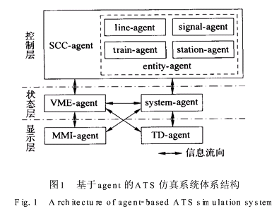 面向agent技术在城轨交通自动监控数字仿真中的应用摘 要:针对国产化轨道交通列车自动监控(ATS)系统建模、仿真方法存在的问题,研究采用agent技术进行轨道交通ATS系统全数字仿真的思路和实现方法.设计了基于多Agent的系统体系结构和语义描述,建立了6类agent的结构模型,并制定了它们的功能属性和控制流程.采用时间步长法的进程推进机制和活动扫描法的仿真策略,在VC++6.0开发环境下,实现了ATS系统可视化仿真.该方法降低了系统设计的复杂度.系统具有可重用性和可扩展性.关键词:城市轨道交通;面向agent技术;多agent系统;自动监控;数字仿真 城市轨道交通具有运能大、速度快、安全、准时、乘坐舒适、节约能源以及能够缓解地面交通拥挤和有利于环境保护等多方面的优点,因此它将在城市市内交通中占有重要地位.随着城市社会经济的发展和城市化进程的加快,城市在交通问题上面临着越来越严峻的挑战,采用自动化、智能化的快速轨道交通解决日益严重的城市交通问题已经成为城市交通发展的大趋势. 根据城市轨道交通系统列车运行的特征,既要保证列车运行安全可靠,又要尽量缩短行车间隔时间和提高轨道交通线路的输送能力,列车运行控制系统(automatictraincontrol,ATC)可以较好地达到上述目的.ATC系统由列车超速防护(automatictrainprotection,ATP)、列车自动驾驶(automatictrainoperation,ATO)及列车自动监控(automatictrainsupervision,ATS)3个子系统构成[1].ATS子系统的功能主要是实现对列车运行的监督和控制[2],辅助行车调度人员对全线列车运行进行管理. 对ATS系统进行全数字可视化仿真,具有成本低、高效率、操作方便、易观测等显著优势.1面向agent的ATS数字仿真系统体系结构的建立 面向agent(AO)的方法是继面向数据流(DFO)[3]、面向数据结构(DSO)、面向对象(OO)之后成为新一代的软件开发方法.面向agent的软件系统具有自治性、协作性、反应性和主动性的基本特性. ATS系统是一个庞大的系统,采用面向对象方法建模过程复杂[4],同时考虑到ATS系统仿真适于分布式仿真,所以非常适合采用agent技术建模,因为轨道交通系统中对象的属性随时间的推移及事件的更新而发生有规可循的变化,鉴于ATS系统具有这种智能化自动控制的特点,所以ATS全数字仿真适合采用agent技术实现. 在ATS系统中涉及的因素很多,根据仿真对象的侧重,作者抽象出6大类agent,即仿真控制中心agent(SCC-agent)、实体agent(entity-agent)、仿真环境agent(VME-agent)、系统agent(system-agent)、人机界面agent(MMI-agent)、运行图agent(TD-agent).其中,实体agent在仿真控制中心agent内部,是线路agent(line-agent)、信号机agent(signal-agent)、列车agent(train-agent)和车站agent(station-agent)4个agent的统称. 系统的体系结构被设计为3层结构:控制层、状态层和显示层(见图1).结构中的每一个层次都代表不同的agent,每个agent都是一个高度自治的实体,具有各自的功能,解决一定的问题,当问题需要协作解决时,它们之间通过消息传递和信息共享相互协作,相互配合,实现对轨道交通的监控与管理.