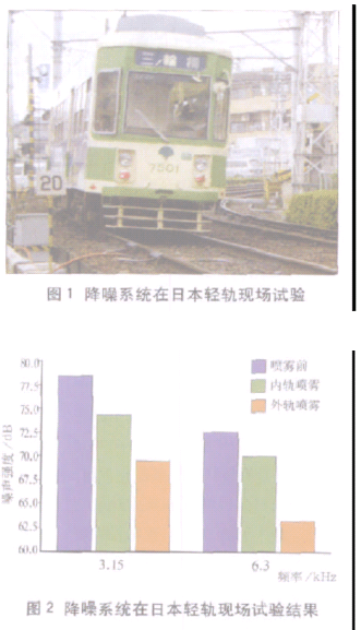 纽约地铁系统在小半径曲线区段和车站附近亦安装了该系统,噪声已由95~100dB降低到75~80dB。纽约世贸大厦站曲线半径仅35m,噪声高达115~120dB安装该系统后,噪声已降低到85dB。在“9.11”事件之后,重装了该系统,噪声继续得到有效控制,噪声控制区段也由152m增加到了450m。 尽管系统的使用是否会使钢轨磨耗减少的结论尚未得出,但轮轨横向力却大幅度降低。 用测力轮对对该系统进行的轮轨横向力测试结果表明,该系统可减少一半的轮轨横向力。在北美的不列颠哥伦比亚铁路(现由加拿大国营铁路经营)、伯林顿北方圣菲、诺福克南方、联合太平洋等几条重载铁路中的试验也表明了同样的结果,曲线上的轮轨横向力最多可降低50%,但并没有降低粘着牵引力和制动力。美国东部快速轨道交通系统也在不断收集相关的试验数据。 目前,在日本已安装有30台路旁轨顶水雾降噪系统。经过4年的使用,证明降噪效果良好,曲线区段的粘着牵引力亦没有降低。为了防止浪费,该系统还安装有雨天开关装置。尽管系统运行良好,但日本铁路已着手试验车载轨顶水雾降噪系统,这样可使所有的曲线区段的噪声得到控制。 水雾降噪系统的试验和应用结果表明,在轮轨接触面形成的薄膜可保持轮轨间的摩擦系数,这使得在没有降低轮轨粘着牵引力和制动力的情况下,降低了由于轮轨滑动摩擦引起的振动和尖叫噪声。依照系统的使用情况不同,降噪效果一般在10~15dB,好的可达20dB。参考文献1Controlling Wheel Squeal OnRapid Transit Systems. Interna-tional Railway Journal.2004(10)