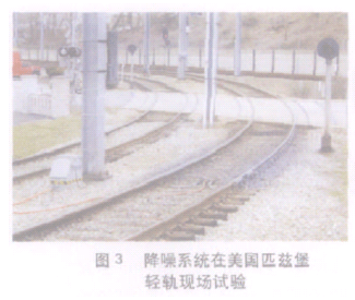 美国匹茨堡地铁地面线路有一段半径91~183m、坡度8%的曲线,混凝土平交道口处在曲线的中部,临近有多撞公寓。在安装轨顶水雾降噪系统前,该区段的噪声高达100dB以上。安装系统之后,噪声已降到80dB,粘着牵引力并未降低(图3)。