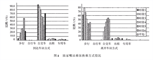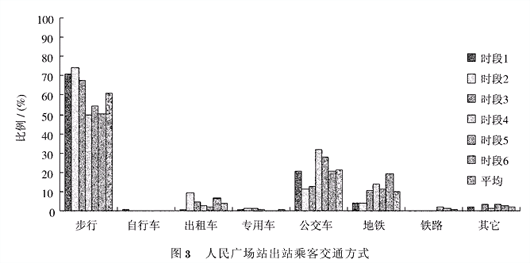 在上海市近期轨道交通规划中,M6线也将通过陆家嘴站,届时该站成为两条轨道线路交汇的枢纽站,也成为地区综合交通体系的重要组成部分,将大大增强该站在陆家嘴以至整个浦东地区的交通地位。 浦东轨道交通由于建设时间较晚,一些站点的各类设施还不尽完备,站点周边土地开发也尚未成熟,可以说还处在一个“不稳定期”。相对于浦东而言,浦西轨道交通1号线建设时间较早,站点设施完备,周边土地开发利用已经较为成熟。因此,选取浦西典型的人民广场轨道站点,分析客流集散特点,对把握浦东轨道站点将来的客流特征和区域影响范围有较大的参考价值。1.2乘客换乘方式分析 换乘方式包括乘客乘坐轨道交通前后两部分。进站以前的交通方式反映的是站点客流“汇集”的特征,而出站后的交通方式反映的是地铁站点客流“疏散”的特征。通过对这两种换乘方式的调查与分析,全面把握地铁站点客流集散特点,并进一步分析这种“集散”对综合交通的影响。(1)进站、出站乘客换乘方式 图2、3反映的是工作日上午7:30~10:30和下午15:00~18:00这6个时间段的换乘情况。人民广场站出站乘客步行比例为61%,乘公交车比例为21%,换乘地铁的比例达到10%。而陆家嘴站出站乘客步行的比例为57%,乘公交车的比例为39%,无地铁之间换乘。此外,两个站点出站后使用自行车的乘客都很少,出租车都占到了一定比例,但都在5%以下[1]。