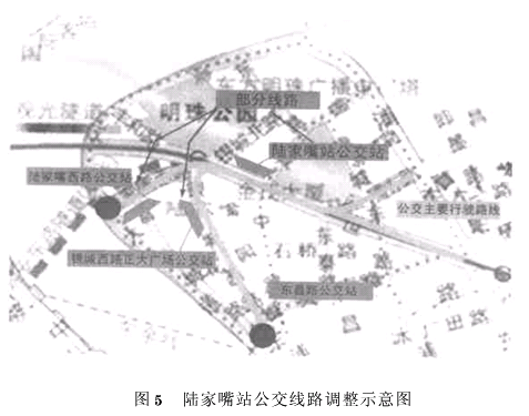 上述数据还说明,不论是进站前还是出站后乘坐公交的乘客比例都非常高。大量的换乘客流乘坐公交车,不仅直接造成陆家嘴站周边局部地段的拥挤,还会影响整个小陆家嘴地区路网的运行状况。特别是在高峰时段,众多的公交线路,大量的公交车辆行驶与停靠,将对局部路网造成较大的冲击。由于目前小陆家嘴地区道路条件好,开发尚未完全成熟,出行发生量小,因而整体上交通状况较好。但是对于陆家嘴站是否适合于作为地铁-公交换乘站,仍然应该给予充分考虑。2区域综合交通改善方法与措施 对于CBD地区,一方面要保证地区的可达性,例如强调小陆家嘴地区与浦东其它地区、浦西地区的联系,这是实现中央商务区功能的需要;另一方面要保证地区内部交通运行的顺畅与稳定,保证该地区与对外交通平稳衔接与转换。作为中央商务区,如果高峰时段地铁与公交通勤换乘比例偏高,会导致该地区增加额外通勤换乘带来的交通压力,同时造成该地区轨道交通“到达”服务水平的降低。 由于轨道交通改善了周围地区的交通可达性,会引发站点地区的土地开发强度增高。类似小陆家嘴地区这样的城市核心区是以商业、金融、贸易、信息、休闲娱乐为一体的公共活动中心,本身建筑密度和土地开发强度就很高。因此,在规划目标下,如何平衡土地开发强度加大对轨道交通的需求与轨道交通便利性导致周边地区交通枢纽功能强化二者之间的关系,值得思考。 在小陆家嘴地区新一轮规划中,世纪大道———陆家嘴东路———银城路五路环交周边地区是陆家嘴休闲娱乐板块,因此需要对行人交通进行充分考虑。陆家嘴地铁站设置在五环的东北侧,对于高密度开发的中央商务区,轨道 步行的交通方式是最为适宜的,但从目前的调查数据表明,小陆家嘴地区是商务金融中心,高峰时段地铁与公交通勤换乘比例偏高(早高峰时段达到70%),而乘地铁到该区域的休闲娱乐比例只有3%,可见交通枢纽的功能日益突出。随着进一步的开发建设,交通吸引量将更大,如果该区域同时承担旅游观光、休闲娱乐、交通枢纽等多种功能,该区域在路网密度不可能增加的限制条件下,将无法很好地保证交通运行状况,实现当初的CBD规划功能。因此,对小陆家嘴地区的区域综合交通改善研究的突破口选定为弱化该地区的交通枢纽功能。 通勤客流选择陆家嘴站进行换乘主要有两方面的原因:一是陆家嘴站公交线路众多,几乎覆盖了浦东地区所有的主要客流方向,而且站点设计较好,换乘非常便利;二是浦东公交线路布局自身的原因,一些主要客流方向,如浦东大道沿线,除陆家嘴站外没有可替代的换乘站,只能在该站换乘。因此,逐步弱化换乘功能将从地面公交与轨道站点的衔接入手。即,对于进入小陆家嘴地区的公交线路,应该是增加该地区的可达性,而不是用作换乘地铁。具体措施可以从以下两方面综合考虑[3]。(1)近期:通过调整公交停靠站,减少在陆家嘴地铁站停靠的公交线路数。 将聚集在陆家嘴站的众多公交线路的停靠站进行分散,是减少地铁站停靠公交车辆数最直接的办法。虽然不同公交线路的具体行驶路线以及停靠站有所不同,但这些线路汇聚到小陆家嘴地区以后,主要集中在两条路线上:经陆家嘴站、陆家嘴西路至滨江大道;经陆家嘴站、银城西路至东昌路轮渡站。这些线路一般在陆家嘴站停靠以后,在银城西路正大广场、陆家嘴西路滨江大道停靠,而这两站间的站距较小。因此,可以将原先停靠陆家嘴站的公交线路跳过该站,仅在陆家嘴西路或银城西路设站。这样就能够在不影响公交线路联系小陆家嘴与浦东其它地区的功能的情况下,减少在地铁站前广场停靠的公交车辆。见图5。