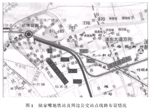 上海轨道交通陆家嘴站换乘特性与区域综合交通改善摘 要 在分析公共中心区的地铁枢纽站换乘特性基础上,综合考虑地铁枢纽站的场所特性,采用大量调查数据对上海人民广场地铁站和陆家嘴地铁站进行对比分析。并以小陆家嘴地区为例,探讨轨道交通和地面公交换乘方式的改变对区域发展的引导作用。小陆家嘴地区应弱化其交通枢纽的功能。关键词 地铁枢纽站,换乘特性,区域交通改善 轨道交通枢纽站点地区作为城市中的一个地域概念,它包含了两个基本的、对立统一的含义:是城市快速轨道交通网络以及城市交通网络的一个节点;同时也是一个场所,一个设施集中、有着多样化的建筑和开放空间的区域。节点的特性反映了站点地区的交通功能,起着客流通过的作用;场所的特性反映了站点地区的空间与开发功能,起着人员驻留的作用。 文献[2]在对上海轨道交通站点地区规划和建设的研究中,依据站点在城市中所处的位置,车站服务的地区性质及其功能,以场所导向型为划分标准,将上海的地铁站点分为公共中心区、交通枢纽区、成熟居住区、城市外围区等四大类。人民广场站和陆家嘴地铁站可以划归入公共中心区站点。该类站点自身的交通特性,以及站点和周边区域土地开发功能之间良好的配合、轨道交通和地面公交换乘方式对区域发展的引导作用等必然成为值得研究的课题。 公共中心区站点周围地区多为公共设施,大型公共建筑较多、公建用地比例高,并且这些公共设施多是为区域乃至整个城市服务的。浦东小陆家嘴地区和浦西的黄浦区共同构成了上海的CBD(中央商务区)核心区。根据小陆家嘴地区的土地利用规划,1.7km2的土地面积在2020年建筑开发体量将达到400万m2,目前开发程度已超过50%。该地区希望按照国际上CBD发展成熟地区的模式,形成中央商务区和休闲商业区均衡发展的模式。按照规划,地处该区域中心偏西的陆家嘴地铁站,将是两条地铁线路交汇的枢纽站。1公共中心区站点客流换乘特性 由于地铁客流集中,发车频率高,大量乘客周期性的集散将给站点周边地区带来相当大的交通压力。在客流高峰时段,这种影响就更为突出。在2003年4月对上海轨道交通3条线的典型站点进行问卷调查的基础上,得出陆家嘴地铁站和人民广场地铁站换乘特性指标。1.1陆家嘴站概况 轨道交通2号线陆家嘴站位于小陆家嘴地区的中心地带,周边土地开发以高级商住、旅游观光为主,客流高峰明显。站点内各种设施完备,共有4个出入口,其中一个与过街通道相连。由于紧邻会议中心、水族馆、正大广场等大型公共设施,站点周围停车场较多。该站接近世纪大道、银城北路、银城西路、陆家嘴西路、丰和路五路环交,周边公交线路众多。其中在站点广场设站的线路就多达19条。陆家嘴站的位置及周边公交站点设置情况见图1。
