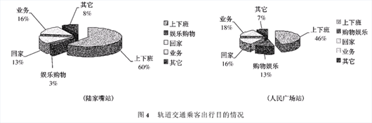 (2)出行目的分析 图4给出了陆家嘴站和人民广场站乘客出行目的分析。人民广场站出站乘客中出行目的为“上下班”的占到46%,而陆家嘴站为60%。人民广场站出行目的是“娱乐购物”的乘客占到13%,而陆家嘴站不到3%。陆家嘴站通勤乘客比例高,表明站点周边地区商务性质强;人民广场站娱乐购物乘客较多,表明人民广场地区对游客的吸引力强于小陆家嘴[1]。 以上分析说明陆家嘴站具有“到达”和“换乘”双重性质,到达客流和换乘客流占到很大比例。由于目前小陆家嘴地区开发尚未完全成熟,因此预计今后该地区建筑面积、入住企业数量、就业人员数量还会有较大幅度提高,交通吸引能力将会不断增强,到达客流也将随之增加。