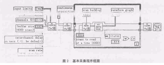 2自动化测试的原理 目前,为测试各类工程参数而研制的传感器已有相关的生产厂家生产,如:应变桥、测振传感器、压电式和电磁式加速度传感器等各类传感器均能满足测试精度的要求,各种新型传感器正处于进一步研究发展之中;而与传感器相匹配的各类放大器如:动态电阻应变仪、电荷放大器、测振放大器等也已有专业厂家生产并已投放市场;传统的记录分析仪器主要是指光线示波器、模拟磁带机等,这些仪器精度低、体积大、价格昂贵、功能单一,不能根据具体要求灵活定制功能,维护与扩展也相当不便,记录下的数据存档不便并仍需人工读取,影响了后续工作的分析精度和效率,成为影响测试工作的瓶颈因素之一.随着计算机技术的日益发展,计算机正逐步被广泛应用到测试领域中.采用以计算机为核心的仪器代替传统的记录分析仪器正成为一种发展的必然趋势. 开发虚拟仪器软件是实现测试自动化的关键,通常可以采用通用软件开发平台,如Microsoft的VB、VC++,Borland的Delphi、C++Builder等,也可以采用专业开发平台,如MathWorks的MATLAB,Agilent的VEE,NationalInstruments的CVI和LabVIEW等.采用LabVIEW等专业开发平台可以大大提高开发效率.3虚拟仪器软件的实现 为了方便开发和维护,我们在轨道动力学测试软件开发平台选用的是NationalInstruments公司的LabVIEW6.1,对于使用更高版本LabVIEW的部门只需对已开发的VI进行重新编译.3.1采集程序的设计方法 LabVIEW采用框图式开发方式,用数据流控制程序的运行,见图2所示.