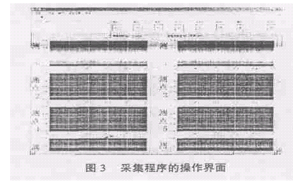 在编制数据采集程序时应力求简单,杜绝由于算法复杂而造成的资源浪费与故障隐患.程序在将数据存盘的同时送屏幕监测.利用数组操作的方法将每个通道的数据分别送至指定的窗口,确保发生故障时可以迅速判断出故障位置. 采集程序首先用“AICONFIG”函数设置参数,然后由“AISTART”函数触发采集过程开始.进入循环体后,一方面硬件把采集到的数据不断交替写入Buffer,另一方面“AIREAD”函数定时读出Buffer中的数据,并清空位置,留给后续的数据.子程序“MYDATAPROC”对“AIREAD”函数读出的数据流加以处理、送屏显示并以二进制格式存盘.采集结束后,“AICLEAR”函数清空Buffer,释放资源. 利用LabVIEW开发出的采集程序具有人性化的操作界面(见图3所示).操作者可在备注信息栏中填入简要的描述,选用合理的采集频率,利用按钮选择所需的通道,定义数据存盘的文件名,若有同名文件存在则运行后有对话框提示覆盖或取消.程序运行后由操作者通过菜单控制启停、存盘以及翻屏.数据经简单的数组拆分操作后按通道送各指定窗口供操作者实时监控.存盘的状态由纵贯屏幕的变色条指示, 存盘后的数据可依据文件头进行自描述.