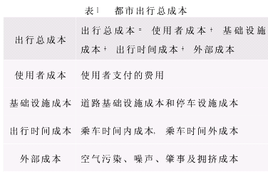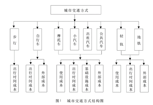 城市交通方式的出行成本量化方法研究摘要:本文通过对步行、自行车、摩托车、公共汽车、小汽车、出租汽车、轻轨、地铁等各种交通方式在使用成本、基础设施成本、出行时间成本以及外部成本等方面进行量化分析,确定了城市出行成本的计算方法,从而为各个城市优化交通结构提供依据。关键词:交通方式;出行成本;数量化 城市交通方式无论是采用自行车、摩托车、公共汽车,还是小汽车、地铁运送乘客,其最终目的是实现乘客的空间位移,当然作为客运存在舒适性的要求。然而在此过程中,不同运载工具的运送时间不同、运载乘客的数量不同、运载工具的使用税费不同,占用道路设施的时间和空间不同、对环境和乘客心理的影响也不同,而这些方面直接影响运输的成本和效益。城市可利用的交通空间和设施是有限的,不可能有哪一种交通方式可以取代全部的出行方式。然而在有限的资源条件下,如何最大限度、科学地使用交通资源,并且从经济性角度给出一个合理的解释,就需要对城市交通的出行成本进行数量化的研究。1研究现状1.1国内的成本研究现状及发展趋势 现在我国城市居民的主要出行方式有自行车、摩托车、小汽车、出租汽车、公共汽车以及轨道交通等。随着国民经济的迅速发展、城市化进程的加快以及加入WTO的影响,我国的机动车拥有量急剧增加。尤其在大城市,由此导致的交通拥挤与阻塞以及居民出行时间的延误、交通事故、环境污染等加剧了交通成本的增长,尤其是外部成本的增长。现在我国城市出行方式量化方面的研究主要集中在城市交通拥挤的探讨方面,还没有形成统一的体系。现代社会的发展必须有良好的交通与通讯系统,一个好的交通与通讯系统,可以降低市场交易成本,提高资源的分配效率。[1][2] 由于城市居民的出行要求是多样化、多层次的,每种出行方式各有其适用范围、相对优势和服务范围,因此既要发挥各出行方式的优势,又要使其能互相协调以满足居民出行的不同需求,发挥系统的整体功能,取得合理的社会、环境、交通、经济及生态等综合效益,这就需要对城市出行方式的成本进行量化分析。只有这样才能满足城市居民所希望的快速、可靠、方便、灵活、安全和舒适的交通系统,并使这个系统以一个合理的成本为基础。我国对城市交通成本作过量化分析的城市并不多,只有台北市做过此分析,而其他的城市(如西安、无锡等)都是从城市客运结构入手,通过某一方面进行成本分析。台北市的城市出行总成本分为以下几项,见表1[3]所示。