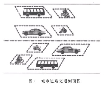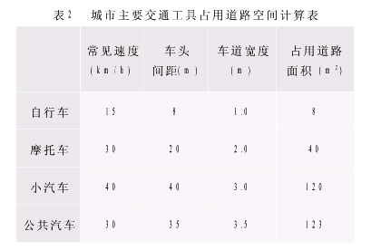 图2是一个某城市道路的双向四车道的侧面图,假设此道路建设长度为10km,宽度为20m,建设费用1000万元,使用年限为20年。在这条道路上的主要出行方式是公共汽车、小汽车(包括私人小汽车)、自行车和摩托车等。由于交通工具在行驶中,前后车头要保持一定的安全间距,且车速不同时应该保持的安全距离也不同;同时,不同交通工具占用车道宽度不同,每辆车可能搭载的乘客人数不同,因此单位乘客在行驶中占用的道路面积也不同。国家的有关设计规范所规定的城市中常用的几种主要车辆占用道路面积见表2。