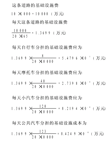 外部成本"主要包括空气污染、噪声污染、拥挤和交通事故几部分成本。这部分的成本量化难度较大,一般采用定性与定量相结合的方法。拟采取方法为:对于空气污染,可根据车辆污染物排放量,欲消除该影响应支付的费用;噪声污染成本可根据降低噪声设施费用确定;拥挤成本可考虑由于车辆数增加,导致路段饱和度增大,从而降低车辆行驶速度,导致的行驶时间延长的损失和污染物排放增加的影响;交通事故可根据统计资料确定。2.3研究方法举例 城市交通的基础设施成本在整个出行成本中占有重要的地位,设想若没有交通的基础设施,交通出行又从何而谈。因此对于基础设施成本中的道路基础设施成本和停车设施成本的分析如图2所示。