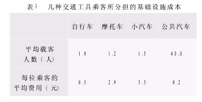又因为每种交通工具载客的人数不同,这几种交通工具每年载客平均数及平均分摊到每种交通工具乘客所承担的费用见表3。