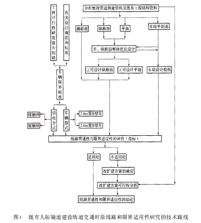 哈尔滨市利用既有人防隧道建设轨道交通的适用性研究摘 要 在分析哈尔滨市既有人防隧道工程特点的基础上,提出了既有隧道改建为城市轨道交通线路时线路贯通性和限界适应性研究的关键技术,并重点阐述了研究的技术路线、技术要点、评价指标体系以及线路设计与限界分析自动化等内容。既有人防隧道经过一定的技术改造可以满足哈尔滨市轨道交通线路的设计要求。关键词 哈尔滨,既有人防隧道,城市轨道交通,线路设计,限界1 研究背景 本着盘活闲置国有资产、节约建设成本的原则,哈尔滨市决定利用既有“7381人防隧道工程”建设轨道交通一期工程[1]。其走向与既有的“7381人防隧道工程”基本一致。尽管既有的人防隧道工程已建成30余年,但理论分析和现场测试研究表明,其结构的稳定性、安全性及建筑尺寸等均符合轨道交通工程对安全性要求[2]。但在利用该隧道时,线路贯通性和限界适应性尚需进行细致的研究与分析,以便全面解决该隧道利用的可行性及其应用策略。 既有人防隧道利用时其线路贯通性和限界适应性研究的主要工作是:在既有人防隧道测量资料及补充测量资料的基础上,分析该隧道改用作轨道交通线路后,在不同车型和供电方式等条件下,线路及限界利用的技术可行性;通过综合比较与分析,推荐改建工程量较小的车辆型式、供电方式以及线路的平纵断面设计方案,并据此对隧道提出初步的整改建议与措施。综合分析可知,线路贯通性与限界适应性分析问题的实质就是:在满足地铁设计规范的前提下,充分利用既有人防隧道工程,并以此为基础确定理想的线路位置,以期最大程度地减小既有隧道的改建工程量。为此,研究中需重点解决以下问题[3]:①技术路线;②技术要点;③线路和限界分析评价指标;④线路设计标准的选择;⑤限界标准的选择;⑥线位优化的理论方法;⑦测量数据的整理与分析;⑧线路设计与限界分析自动化等。 本文仅对研究的技术路线、技术要点、评价指标体系以及线路设计与限界分析自动化等方面的要点加以介绍。2技术路线 本工程的线路设计优化过程中,吸收了铁路既有线改建中横断面定线的思想:以各实测断面为设计横断面和计算横断面,找出该断面上满足限界条件的双线中心线可移动范围及平、纵断面上的控制点;然后综合考虑控制点位置及各设计横断面的计算信息进行平纵断面优化设计。基于此,并综合分析各方因素,整个研究的技术路线如图1所示。