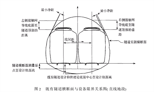 3技术要点 根据技术路线及研究内容的要求,线路与限界适用性研究的技术要点归纳如下。1)确定计算断面基点位置 以实测断面为计算断面,确定其基点位置:(1)横向坐标(X值)选择测量原点的X值;(2)竖向坐标(Z值)通过拱脚坐标确定。 通常,实测断面有两个拱脚点,则以两个拱脚点连线的中点坐标作为基点坐标;如果实测断面只有一个拱脚点,则基点的竖向坐标等于该拱脚的竖向坐标。2)比较隧道横断面及车辆设备限界 以基点为双线中心,加载所研究车型的车辆设备限界。根据线路设计标准中确定的线间距和曲线半径计算左右侧限界开凿量(分左右侧,正值为富余量,负值为不足量)。3)标注平面线路允许移动范围 对左右侧开凿量之和大于零的断面,在平面上标注允许变动范围及最合适平面线位(一类平面中线符号,取允许变动范围的中点作为最合适平面线位)。依次连接各里程的左右两侧的允许移动范围的边界点,构成线路平面中心线位的可移动范围。4)计算新基点坐标 (1)对左右侧开凿量之和小于零的断面,求新基点坐标。新基点竖向坐标比基点竖向坐标下降150mm(即,隧道仰拱理论底面中心至设计轨面高由理论值1200mm降低到1050mm),新基点水平坐标不变。以新基点为双线中心加载上述车型的车辆限界,重新计算左右侧开凿量。 (2)如果以新基点计算的左右侧开凿量之和小于零,新基点为平面及纵断面的双重控制点;如果以新基点计算的左右侧开凿量之和大于零,则在平面上标注允许变动范围及最合适平面线位(二类平面线位),在纵断面上标注普通控制点符号(仅在高程方面受控制)。5)标注纵断面线允许移动范围 计算每个里程点设备限界在横断面上的竖向最大移动范围,即高程约束信息。最大高程约束值按该里程点左右侧开凿量之和为零或逼近零时所对应的高程;最小高程约束值按该里程点隧道仰拱理论底面中心至设计轨面高为1050mm时所对应的高程。根据线路纵断面的设计情况,可以适当降低最小高程约束值。依次连接各里程的最大、最小高程点,构成线路纵断面的可移动范围。6)计算控制点位置 对每个计算断面,计算出新基点坐标、左侧开凿量、右侧开凿量、理论拱脚垂向差、平面移动范围、纵断面移动范围等,形成以里程排序的计算断面的全信息表。7)输出定线辅助信息 根据平、纵断面控制点,以及全信息表,定平面及纵断面。8)线路平、纵断面的理论计算 以平面、纵断面控制点等为约束条件,以改建量平方和最小为目标函数,通过优化方法定出满足约束条件的线路平面和纵断面。9)限界计算与分析 根据优化后的线路平、纵断面,精确计算各计算断面的限界开凿量,以及轨道结构高度等特征值。如果限界开凿量为正值,则表示线路有调整的余地;如果限界开凿量为负值,则表示限界不足,没有调整余地,需要改建。负值的绝对值越大,改建量越大。10)线路平、纵断面设计方案的改善与限界分析 根据现行《地铁设计规范》和本线设计标准,对理论优化线位的平面和纵断面进行人工调整,以最大程度地满足规范的设计要求,最后根据调整后的方案重新计算限界评价指标,最后对线路的贯通性和限界的适应性作出评估。4评价指标 要正确评价既有人防隧道工程改为用城市轨道交通线路后线路贯通性和限界分析的可行性,必须建立一套科学的评价技术指标体系。 根据《地铁设计规范》及相关规定,结合既有隧道改建的实际情况,分别从线路设计和限界分析两个方面,建立了相应的评价指标体系。线路设计评价指标主要包括最小曲线半径、最小夹直线长度、缓和曲线长度、线间距、设计坡度、竖曲线半径、最小轨道结构高度等;限界分析评价指标包括左右侧顶部最小净距、左右线接触网导线底至隧道顶部的垂距、既有隧道设计仰拱理论底面中心至设计轨面高、既有隧道横断面测量原点至设计轨面高等。上述各项指标值原则上均按《地铁设计规范》来确定,但考虑到既有人防隧道工程的再利用特点,特殊情况下个别标准可以适当放宽[3]。限界分析的主要指标含义及既有隧道横断面与设备限界关系如图2所示。