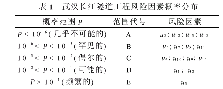 通过前面的分析和计算,得出长江隧道工程施工阶段可能发生的主要风险事件发生的概率以及发生后造成后果的等级,将每个风险事件的概率和后果等级组合起来,再参照表5,就可以确定每个风险事件的等级(表6).
