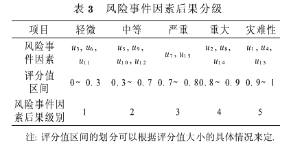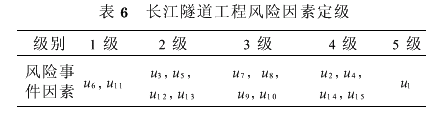 根据计算的综合评价值,用五个区间将长江隧道工程的15种风险事件因素纳入上述后果评语集V定义的五个级别,具体划分情况见表3.