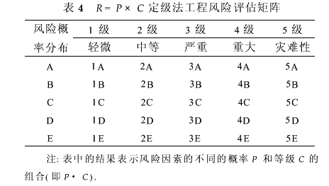 3.3风险定级 表4是R=P×C风险定级法的工程灾害风险评估矩阵,表中数值和字母的组合就是表示风险事件的P和C的组合.