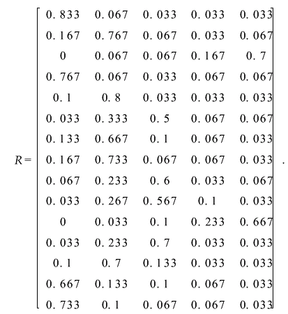 c.计算模糊关系距阵R.作为从U到V的一个模糊映射,可以确定一个模糊关系R,它可以表示为一个模糊矩阵(式(1)).rij可以通过专家投票百分比法确定,即由专家及有关人员组成投票小组,按照评语等级分级标准,在每项评价因素的m个等级中进行投票,最后以百分数确定rij.通过专家投票,经统计和计算,就可以得出模糊距阵R.以计算r11为例,专家30人中,对评价因素u1的5个评语中,投V1的有25人,则r11=25/30=0.833.依此类推,可计算得到R矩阵的其他因素,得到R为