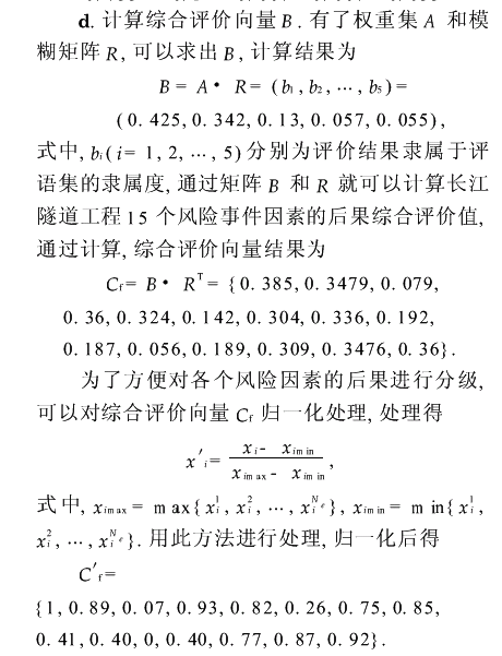 确定了风险因素的等级后,就可以将对风险因素抽象的认识变成定量的具体的认识,根据风险的级别确定风险控制的重点,结合各个风险因素发生的概率和产生的后果拟定合理的风险管理和控制计划,让风险管理的目标明确化,实现合理经济的风险管理.4结 语 大型水底隧道工程,由于其地质环境的特殊性,在施工阶段可能存在各种各样的风险,如果对风险事件的认识和分析仅仅局限于其外在表象,那么风险管理将无从着手.从纷繁复杂的风险表象中,找出风险事件发生的概率以及其发生后造成后果的严重程度,用定量方法将这两者结合起来,正确定位各个风险因素,从而采取合适的策略有效控制和管理风险.参考文献[1] 易萍丽.现代隧道设计与施工[M].北京:中国铁道出版社,1997.[2] 高渠清.高渠清隧道及地下工程论文选集[M].北京:中国铁道出版社,1996.[3] 谷达华.城镇土地定级方法的研究——以安岳县城镇为例[D].重庆:西南农业大学资源环境学院,1998.[4] 王新洲,王树良.模糊综合法在土地定级中的应用[J].武汉测绘科技大学学报,1997,(1):42-45.